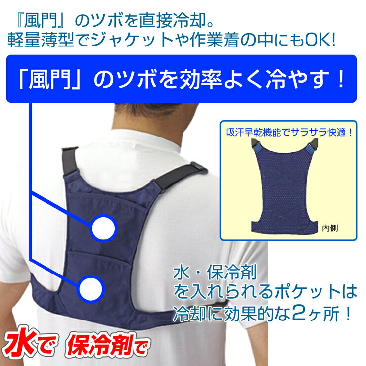 夏の現場・熱所での作業・猛暑・暑さ対策に! 日射・熱中症対策、夏バテ対策に! 保冷剤を使って体を冷却し熱中症対策!成人男性〜女性・子供用サイズまで肩ベルトのサイズ調節が可能。