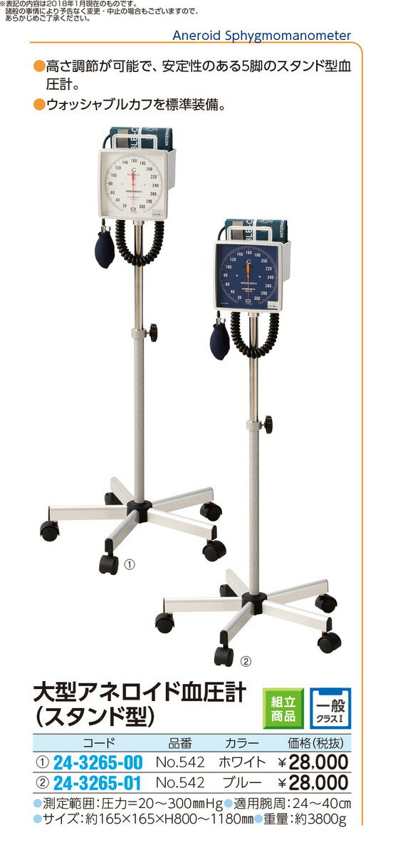 大型アネロイド血圧計(スタンド型) NO.542(ホワイト)Wカフ品番 24-3265-001入り 一般 診察・診断 診断機器 定価\28000 JAN 4560105682083 ●定価¥28,000円(税別)●商品説明●高さ調節が可能で、安定性のある5脚のスタンド型血圧計。
