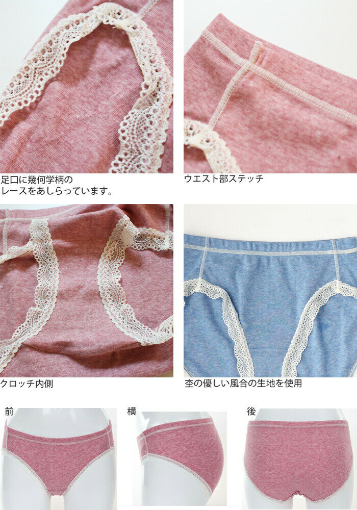 BICO 綿100% オーガニックコットン レース付ショーツ カラー アイボリー・ピンク・ブルー・グレー サイズ サイズ ヒップ 総丈 M 約87〜95cm 約25cm L 約92〜100cm 約26.5cm 原産国 日本製 素材 綿100% レース部:ナイロン・ポリウレタン 洗濯表記 洗濯機可(ネット使用) メール便 ◯ 特徴 杢の優しい色合いに、幾何学柄のレースを足口にあしらい、カジュアル過ぎないデザインになっています。